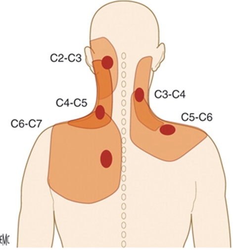 La columna cervical puede proyectar dolor hacia la región interescapular, sobre todo hacia el ángulo superointerno de la escápula. Algunas neuralgias cervicobraquiales o cuadros de compresión nerviosa cervical empiezan dando dolor en esa zona antes incluso de bajar hacia brazo o mano. Por eso, cuando hay dolor entre las escápulas, conviene explorar bien el cuello aunque el paciente no lo señale como su principal problema.